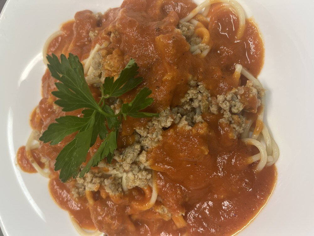 Свинина таз, лук морковь,специи,,спагетти, томаты, в собственном соку сыр