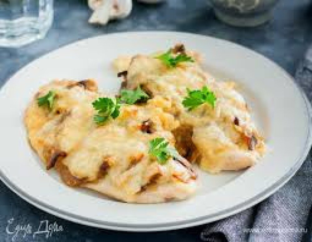 Филе цыпленка,грибы шампиньоны лук ,специи сыр майонез