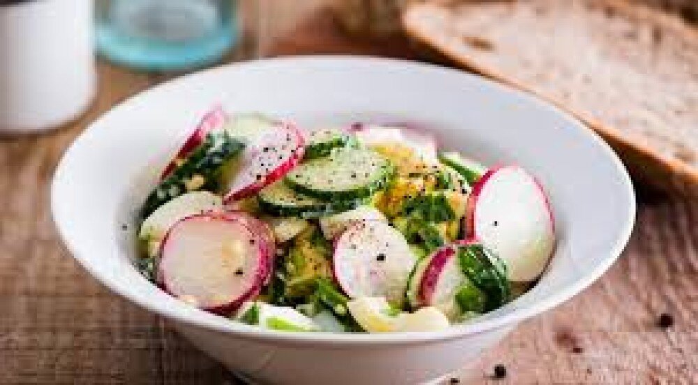 Салат из редиса, огурца, зеленого лука со сметаной и яйцом