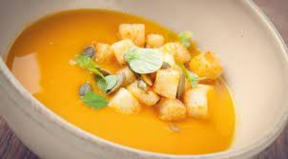 Тыква,морковь,лук свежие ,бульон, сливки,специи, пшеничные гренки