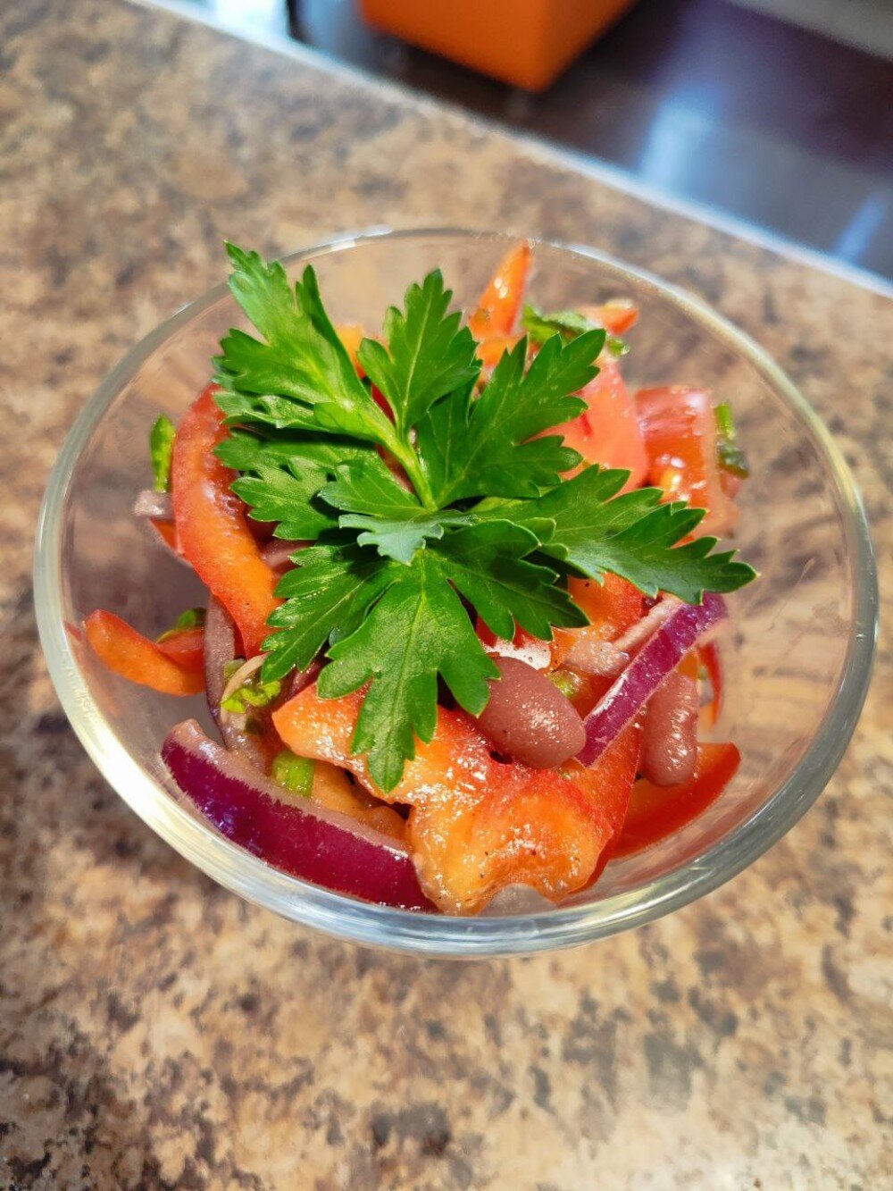 Перец свежий ,фасоль консервированная,томат,чеснок заправка на растительном масле зелень