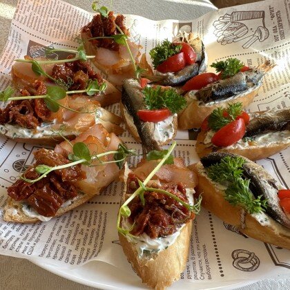 Брускета со шпротой,намазкой с зеленью и томатом чери