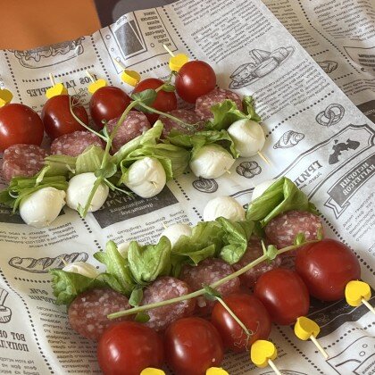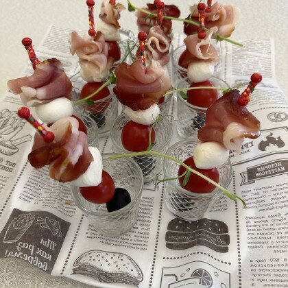 Канапе из пармского окорока ,чери,моцарелы и маслины